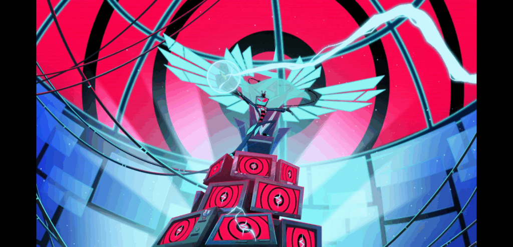 Hazbin Hotel Season Two focuses mostly around the rise of Vox, the leader of VoxTek and leader of “The Vees”, a vast media empire that includes Valentino and Velvette. After the events of the first season where Hell successfully defended itself from Adam and the Archangels, Charlie spent the season desperate to prove to all of Hell that Sir Pentious was redeemed and the hotel works. Vox, however, was able to successfully use his media empire and populist appeal to continually spin it into that of Heaven plotting revenge for their fallen and that Hell’s only salvation lie in him, and his plan to ultimately take over heaven and the Kingdom of God, and become a god. A tall order, given the only person close to a god is Lucifier, and he’s very much chained to the bottom of hell. With all his rubber duckies.