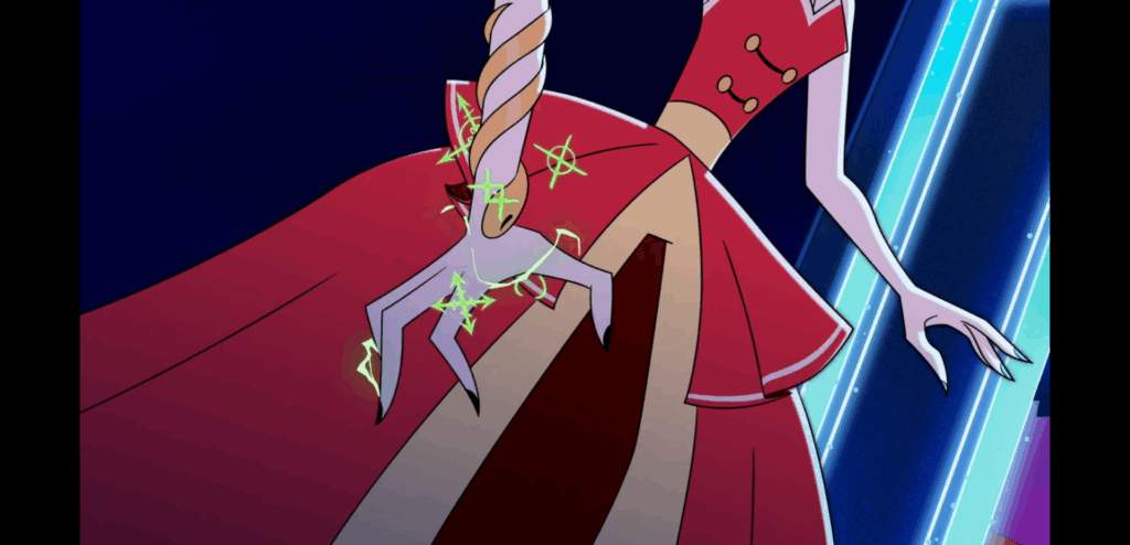 Alastor created enough of a ruckus to get Vox to fight him, and then called a truce and offered to be captured on the conditions that his vassals be released, and Vox was not to lay a hand on Charlie Morningstar. Vox, completely ADHD’ing over Alastor surrendering to him, glossed over that fact when sealing the deal. This gave Alastor two important deals, one from Charlie to do him a favor, and the other with Vox not to touch Charlie. But how would these be executed? Well it seems in Vox’s big jubilation over his pending victory over Heaven with a Big Fucking Space Laser powered by Lucifier and inviting Charlie to humiliate her, he once again fell right into Alastor’s predictable trap. First he traded Charlie’s favor for having her proclaim Vox is the strongest sinner in hell. That seemingly broke his bond with Rosie. Then he couldn’t help but put his hands on Charlie’s shoulders, which broke his deal with Alastor. Just hands on shoulders. You’d think Vox was Joe Biden all the sudden, but a deal is a deal in Hell as Alastor warned, and that was enough to ensue their fight. Which, technically, Alastor didn’t really win either. He spent so much time mucking with Vox’s shark pet that the deed was kind of done by Val and Vel, who hauled his screen-only body away with them. Does this mean Vox will still be alive and able to plot or scheme himself back to power? Or is he nothing without his media empire, now in control of presumably Val and Vel?